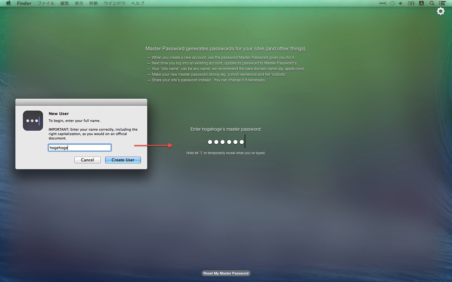 ユーザー名を設定して、そのユーザーのMaster Passwordを入力