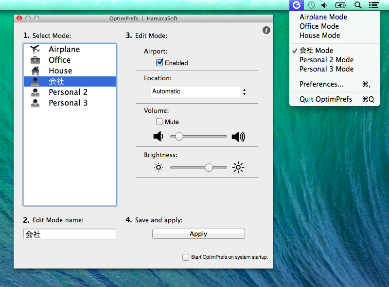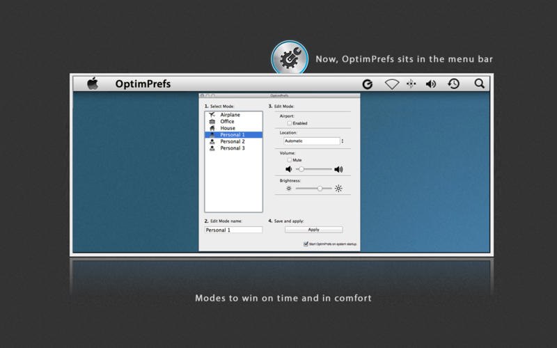 メニューバーに常駐し、Wi-Fi, 位置情報, ボリューム, 輝度の設定全てをワンクリックで変更できるMac用アプリ「OptimPrefs」が無料セール中です。詳細は以下から。