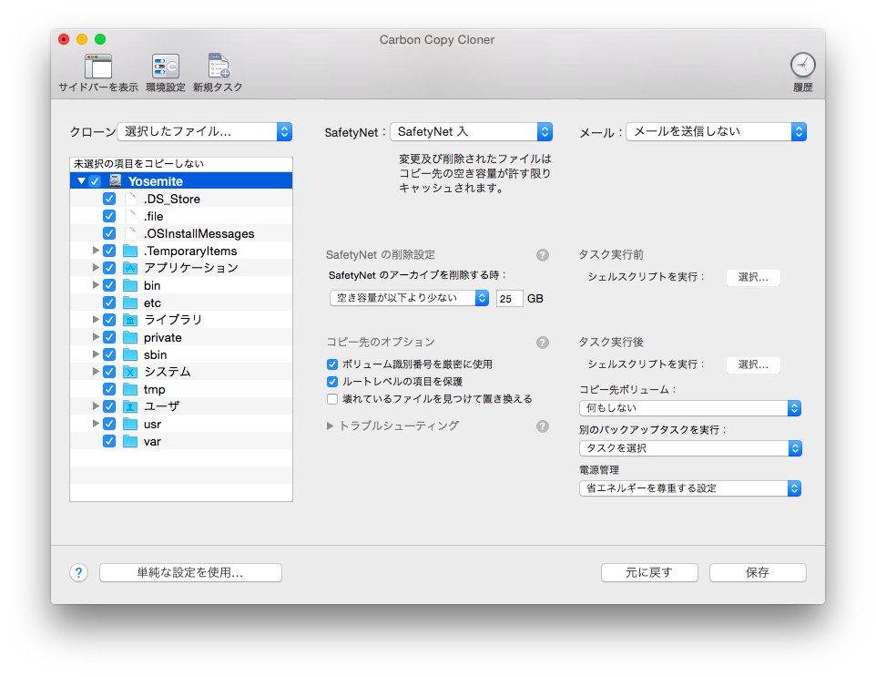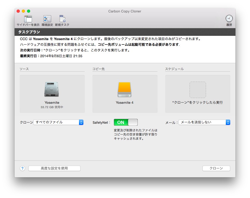 Beta版はBombich Softwareにメール登録すると送って頂けますが、CCC 4ではバックアップ設定がCCC 3に比べて更にシンプルになっており、CCC 3で行っていた細かい設定は「高度な設定を使用」をクリックすることで表示されるようになっています。