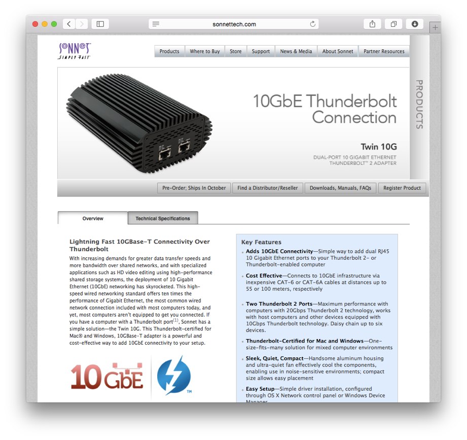 SonnetがThunderbolt 2を10 Gigabit Ethernet x 2に変換できる「Twin 10G(TWIN10G-TB2)」を発表しています。詳細は以下から。
