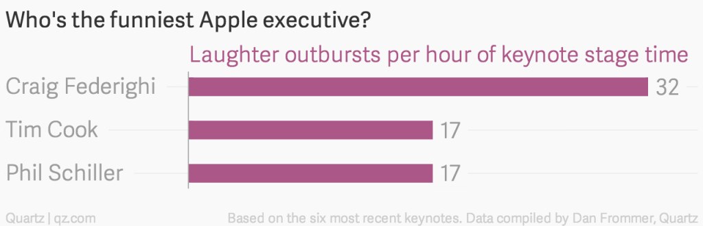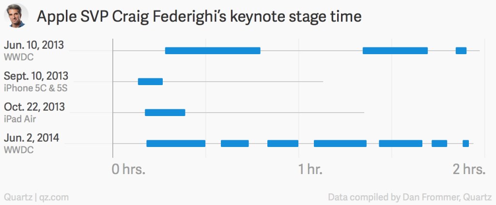 最近の基調講演(WWDC 2014)では5,000人の聴衆が117分の講演の中で50回以上の爆笑を取り、100回以上の拍手を得ている。Quartzが最近6回のApple基調講演で「Appleの役員の中で誰が一番笑いを取っているか」を調査したところによると、1位がCraig Federighiで2位のCook CEOの倍の笑いを取っているそうです。
