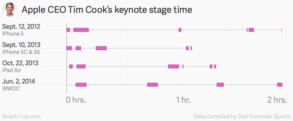 Tim Cook CEOになってからは違うアプローチが取られており、彼は基調講演の司会をしている。Appleの業績からはじまり競合相手をからかったギャグを入れた後、ソフトウェア担当のCraig Federighiやハードウェア担当のPhil Schiller上級副社にステージを手渡している。チャートを見てもらえば分かるとおり、Cook CEOは各イベントで20分未満の登壇をしている。しかしこれは彼が(Jobs CEOから)引き継いだAppleという会社をよく理解し、Appleコミュニティ(Appleファンや顧客)の邪魔をしないようにしているからである。