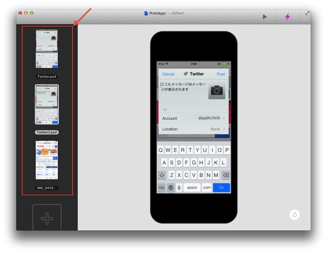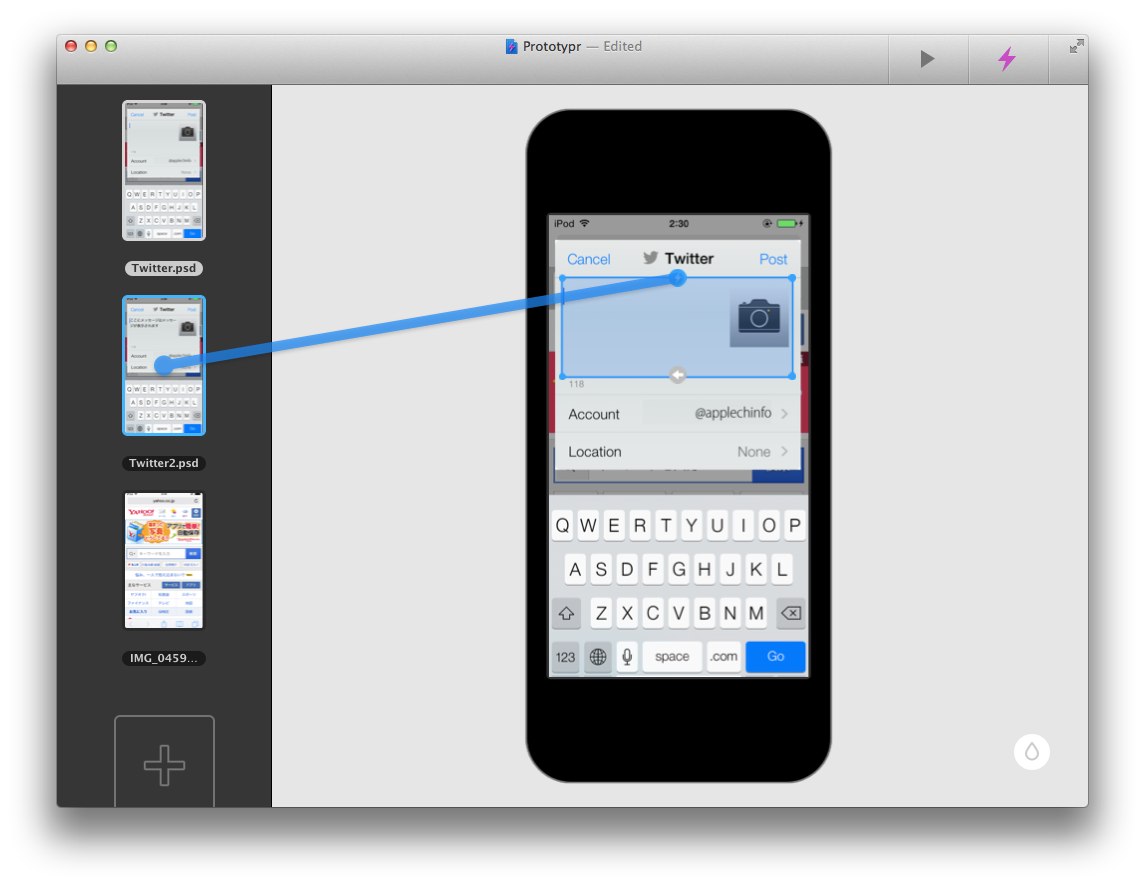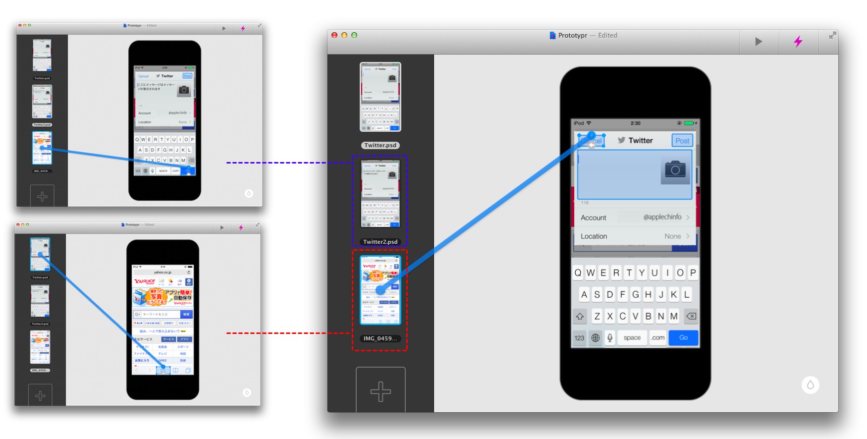 さらに、Prototyprにはタップエリアを指定して画像を変更できる機能があります。先ほどのデモ画面を複数用意し、Prototyprにインポート。