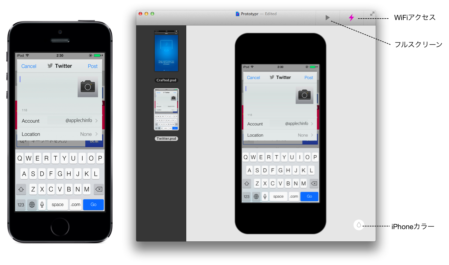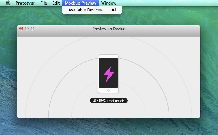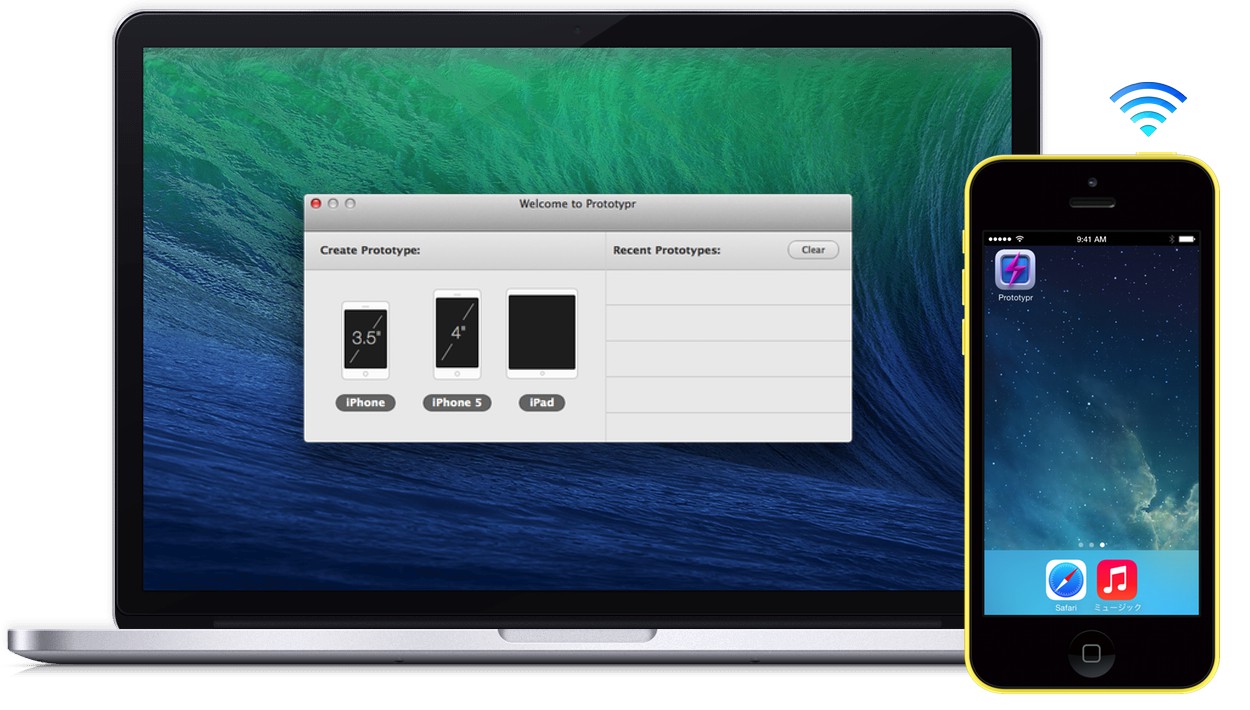 使い方はまずMacとiPhone/iPadにPrototyprアプリをインストールし起動。(画像はWiFi経由でiOSアプリに表示するため同じネットワーク内にMacとiOSデバイスを置いて下さい)