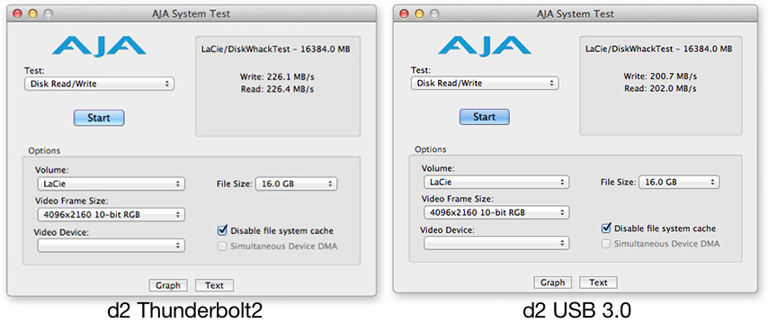 AJA System Testのスコアは「d2 Thunderbolt 2」がWrite 226.1MB/s, Read226.4MB/s、「d2 USB 3.0」がWrite 200.7MB/s, Read 202.0MB/sとなっています(SSD Upgradeキットはまだ準備中のようです)。