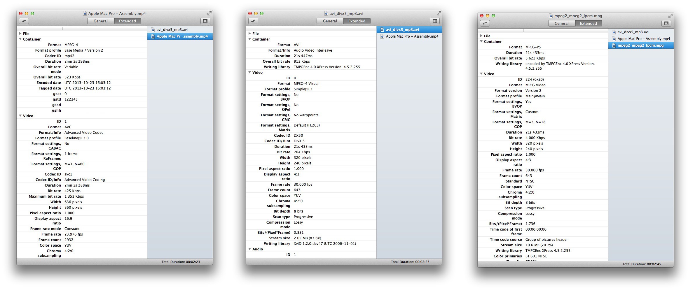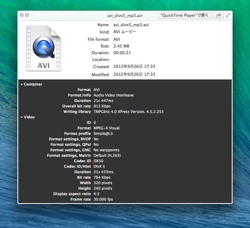 ビデオ、オーディオ情報はオープンソースのファイル判定アプリMediaInfoのデータを使用しているのでAVicodecや真空波動研(Windows)よりも詳しく表示してくれます。