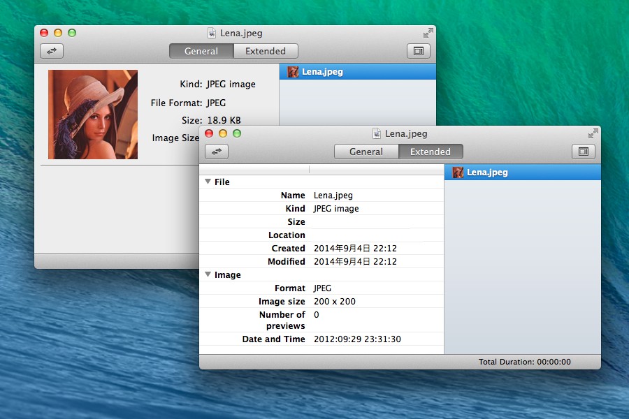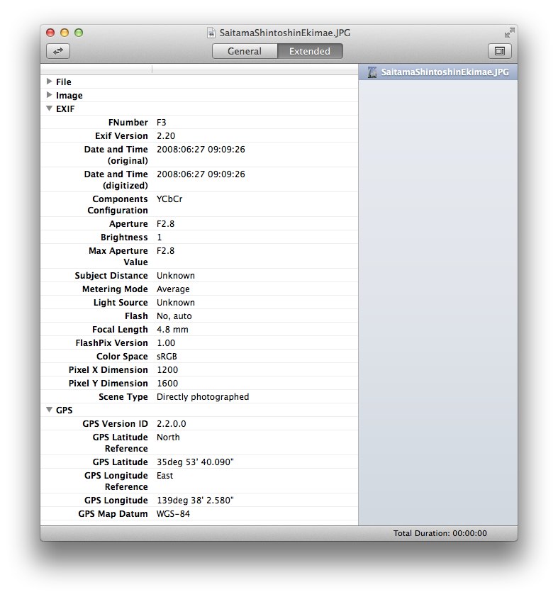 Invisorは[General]と[Extended]の2つのタブがあり、[General]では拡張子やファイルサイズなどFinderに表示される情報を、[Extended]ではファイルのヘッダーやタグに埋め込まれている情報を表示してくれ、写真ファイルの場合はEXIF, GPS, MakerNote, IPTC情報が表示可能です。