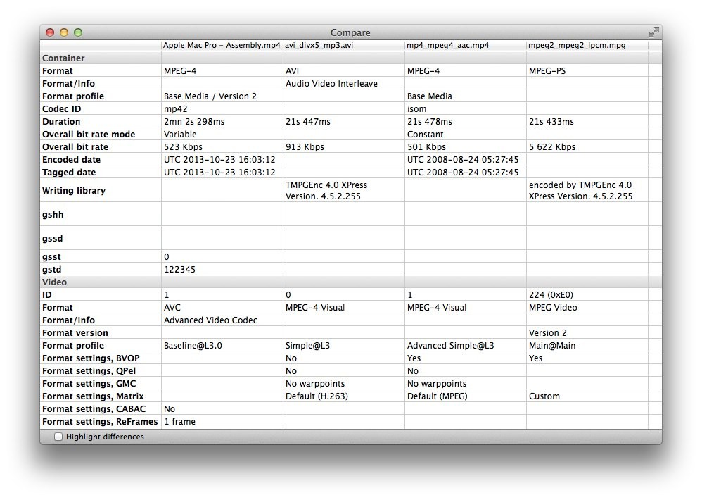 また、複数のファイルの情報を比較出来る「Compare」機能もあり、これらの情報をCSV形式で書き出すことも可能です。