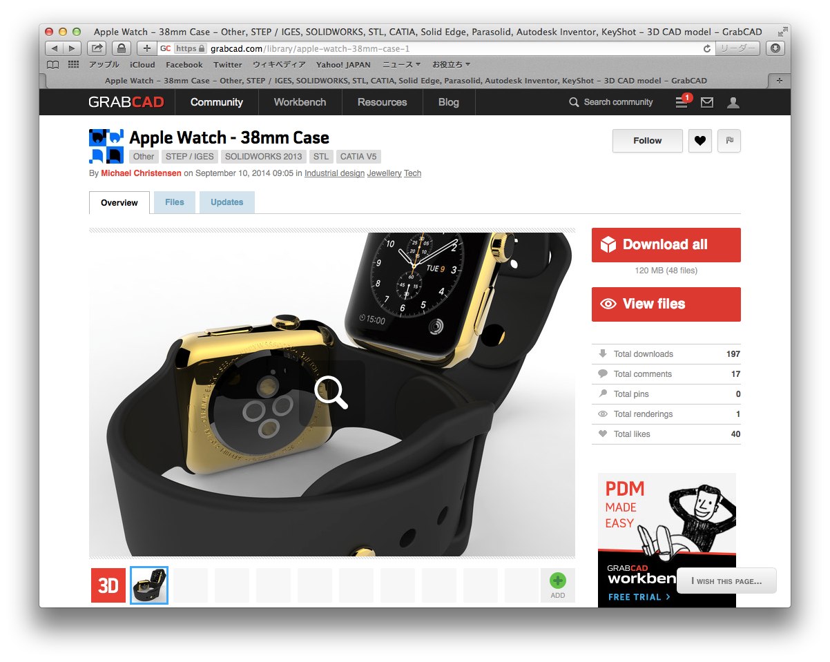 Apple WatchのPSDやSketchデータが投稿され始め、3Dプリントデータも出回っていないか探していたところ、3DプリントデータサイトshapewaysにコミュニティユーザーがApple WatchのディスプレイサイズからApple Watchの全体を予測し作成したApple Watchの3D CADデータ(.stl)が公開されていました。