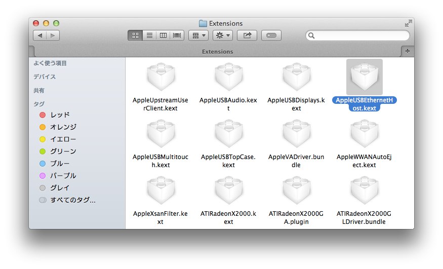 1./System/Library/Extensions/へ移動して「AppleUSBEthernetHost.kext 」を削除(バックアップを取っておいて下さい)。