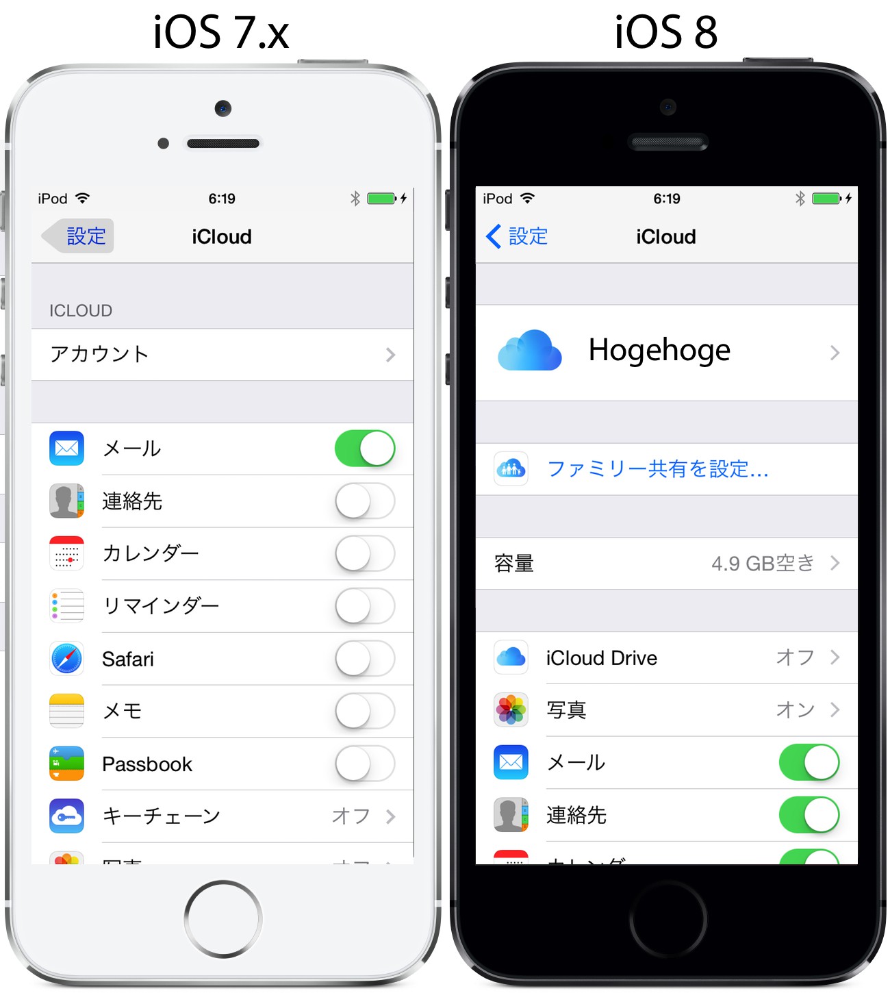iOS 8からiCloudとの連携が強化され、iCloud Driveやファミリー共有が設定できるようになっており、設定アプリの[iCloud]にもその項目が追加されています。