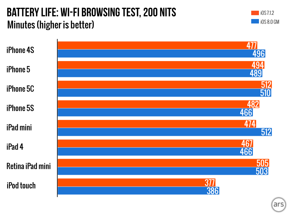 Ars TechnicaがiPhoneやiPadをiOS 8にアップデートする前後でのバッテリーパフォーマンスを比較したベンチマーク結果を公開しています。