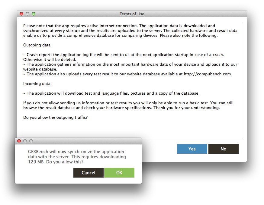 アプリを起動するとGFXBenchのプライバシーポリシーが現れ