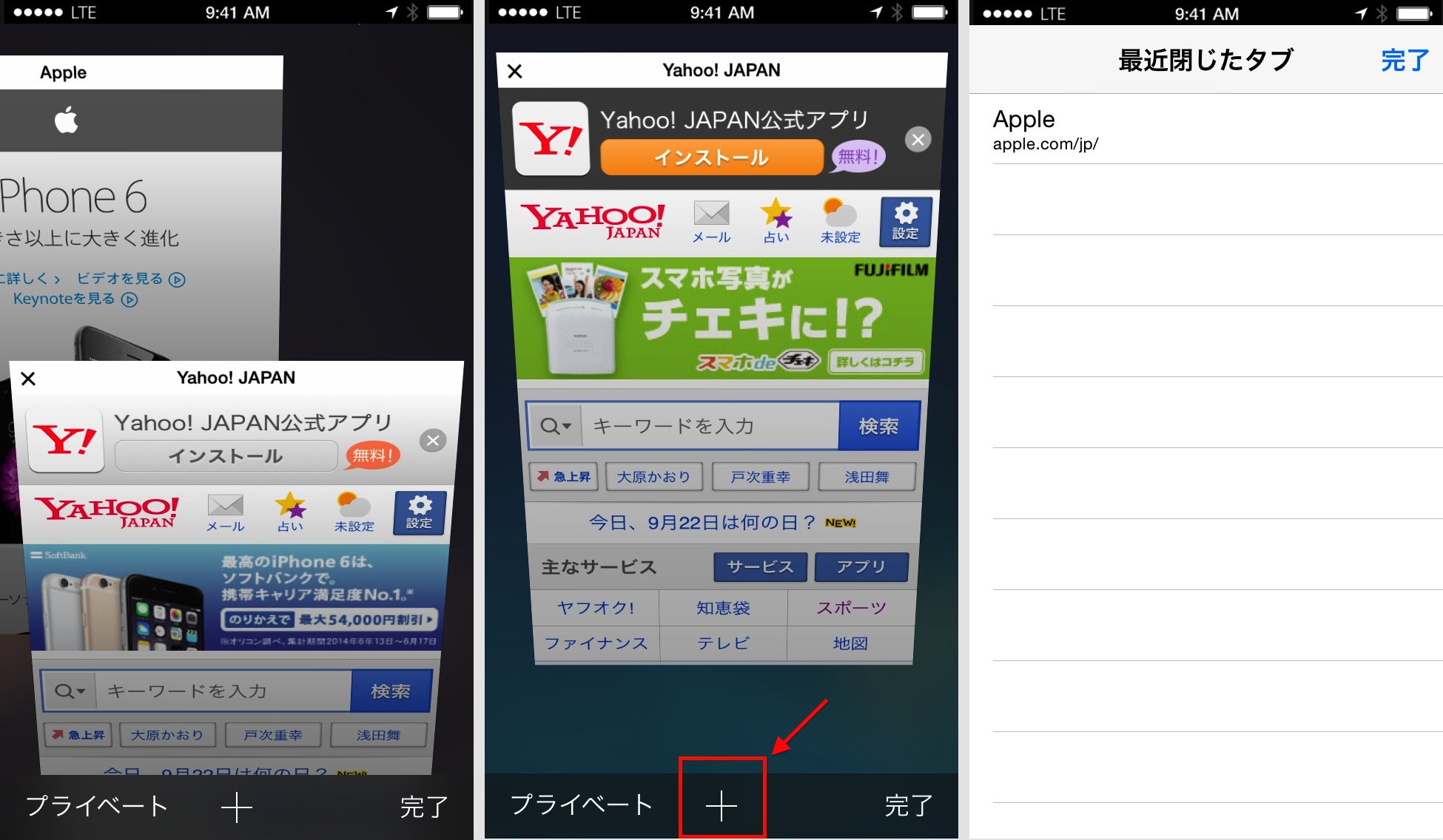 この話題はRedditに投稿されており、iOS 7ではiPad版のMobile Safari 7にしか無かった機能で、タブを表示し新しいタブを出すボタン(+ボタン)を押したままにすることで「最近閉じたタブ」パネルを出すことが出来ます。