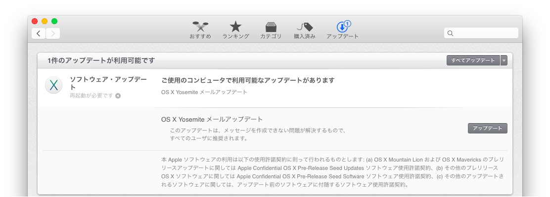 このアップデートはOS X Yosemiteの DP/PBを対象としたもので、メッセージが作成できない問題が解決されるそうです。このアップデート後のMailアプリのバージョンは「8.0 (1985.4)」です。