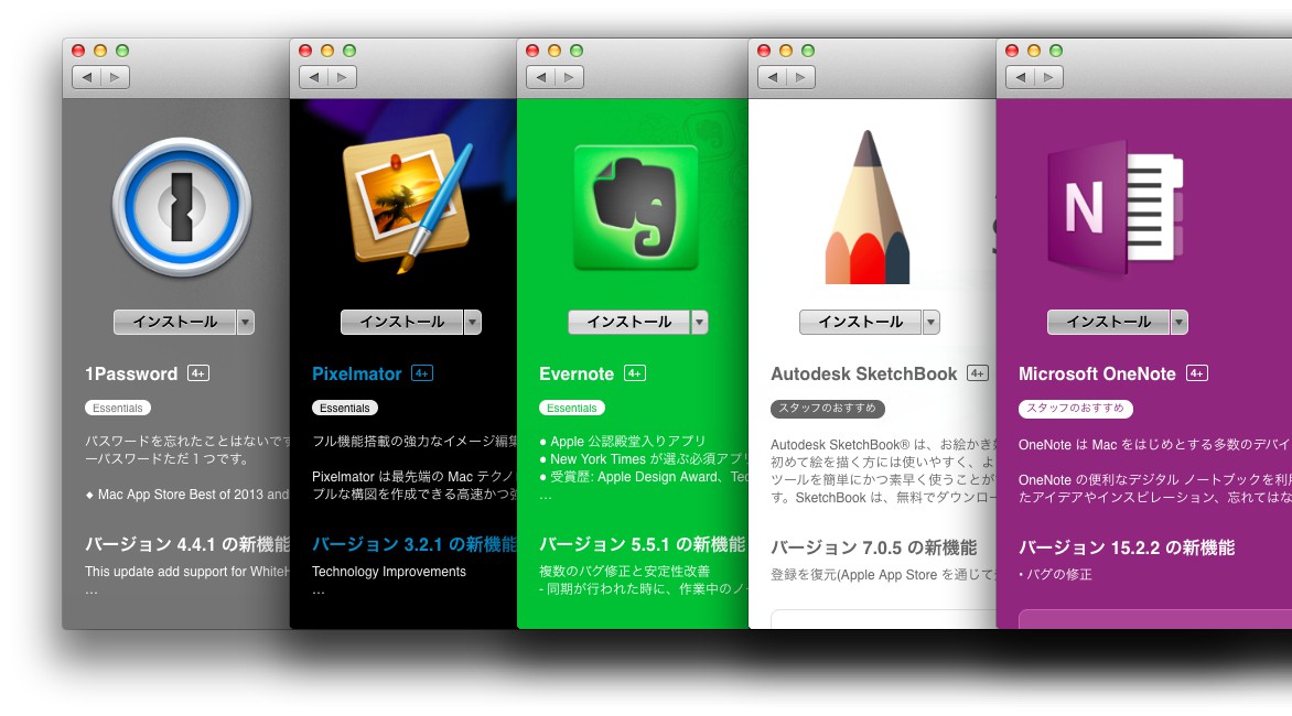 iOS 8 のApp Storeでは一部のアプリに「Editors’ Choice(スタッフのおすすめ)」や「Essentials(必須アプリ?)」などのバッチが表示されるようになっていますが、Mac App Storeでも同様の表示が開始されているようです。