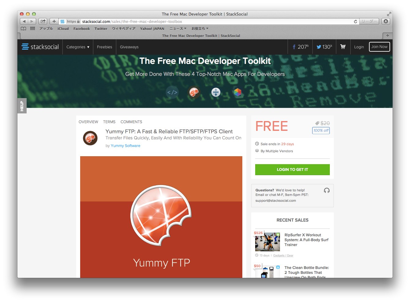 StackSocialがYummy FTPなどMac App Store価格で合計2000円分の開発者用ユーティリティアプリを無料で提供するプロモーション「The Free Mac Developer Toolkit」を実施中です。