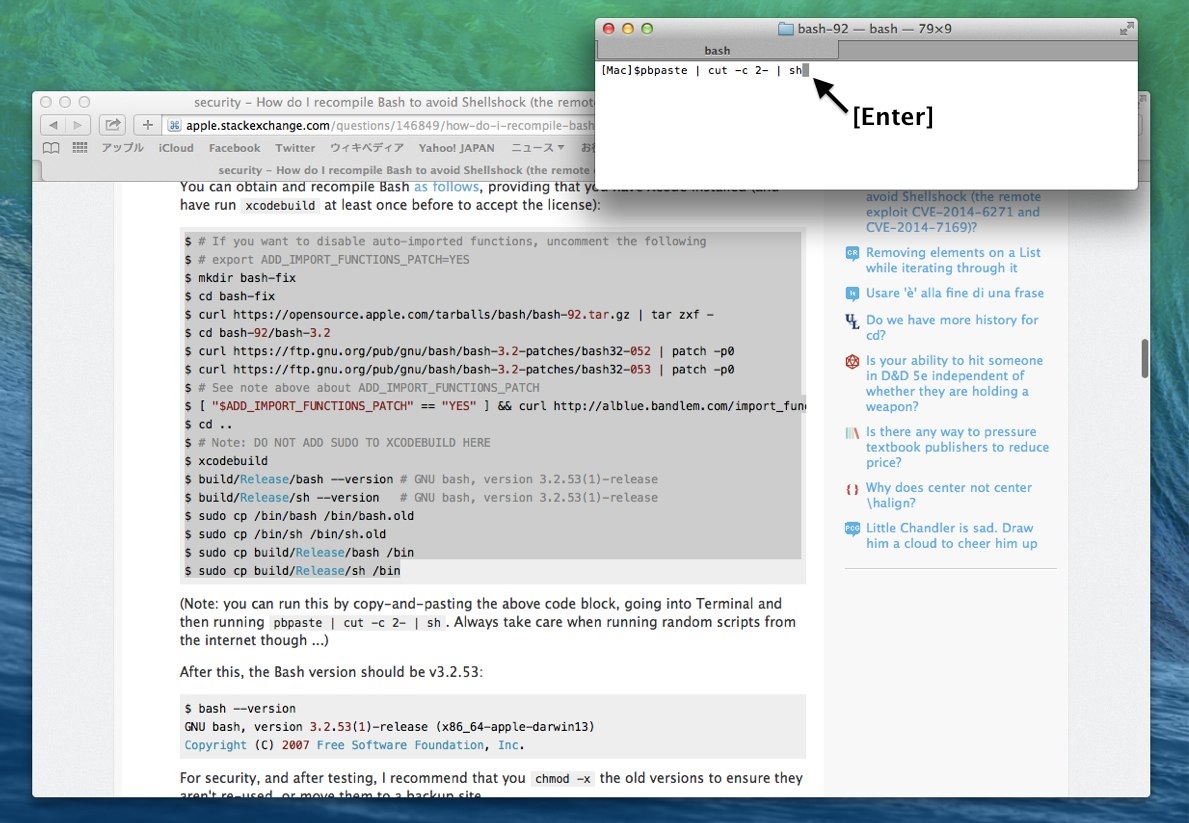 以上はMacのpbpasteコマンドでクリップボード上のパッチスクリプトをターミナルに渡し、スクリプトの前2行($ )を削除、shで実行という動作をするので、後は途中でターミナルが求めてくるrootパスワードを入力してやるだけでShellShock用 Patch 53が当てられます。