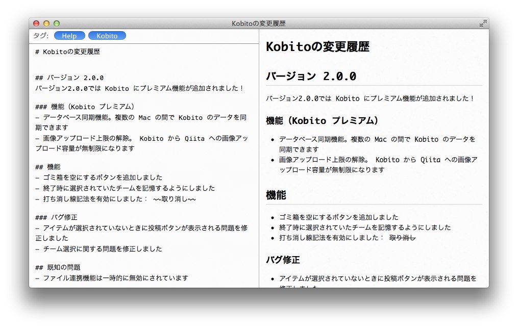 Kobitoは開発者向けSNSサイトQittaが開発しているMarkdown記法を採用したメモアプリで、自社サイトで公開していたバージョン 1.xをバージョン 2.0にアップデートしMac App Storeで公開しています。