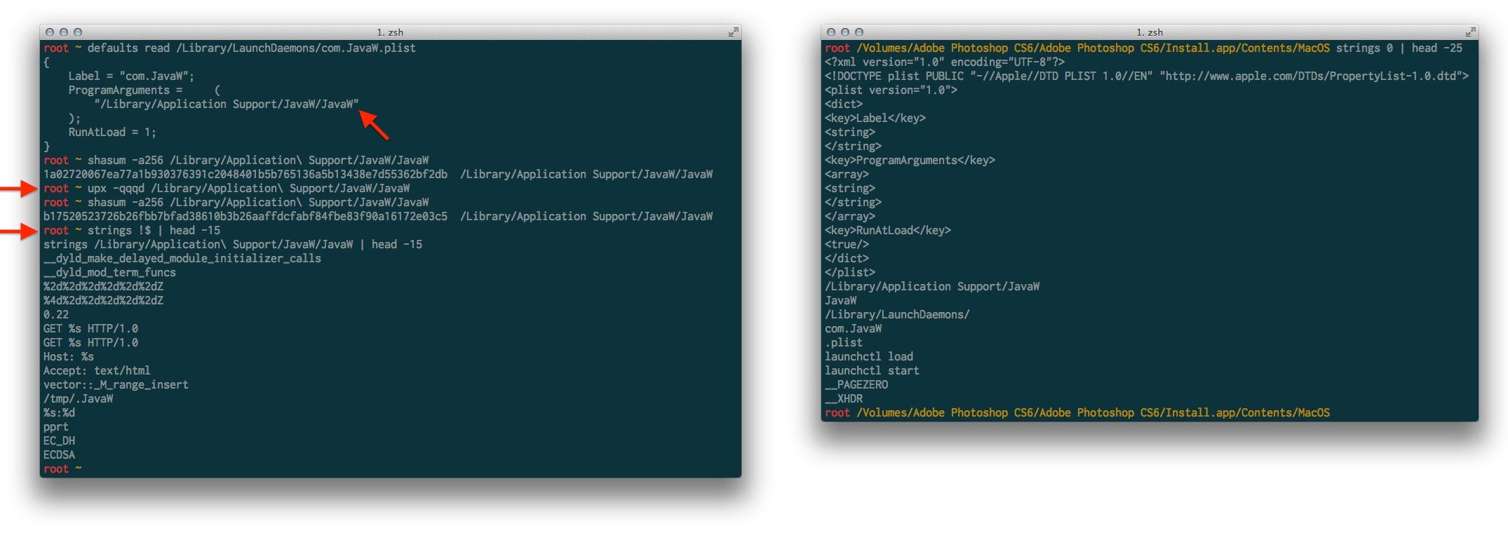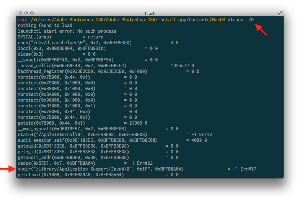2.この「0」という実行ファイルをdtruss(指定した実行ファイルをトレースするコマンド)を使用してトレースすると「/Library/Application Support/JavaW」を作成していることが分かります(ターミナル下から2行目)。