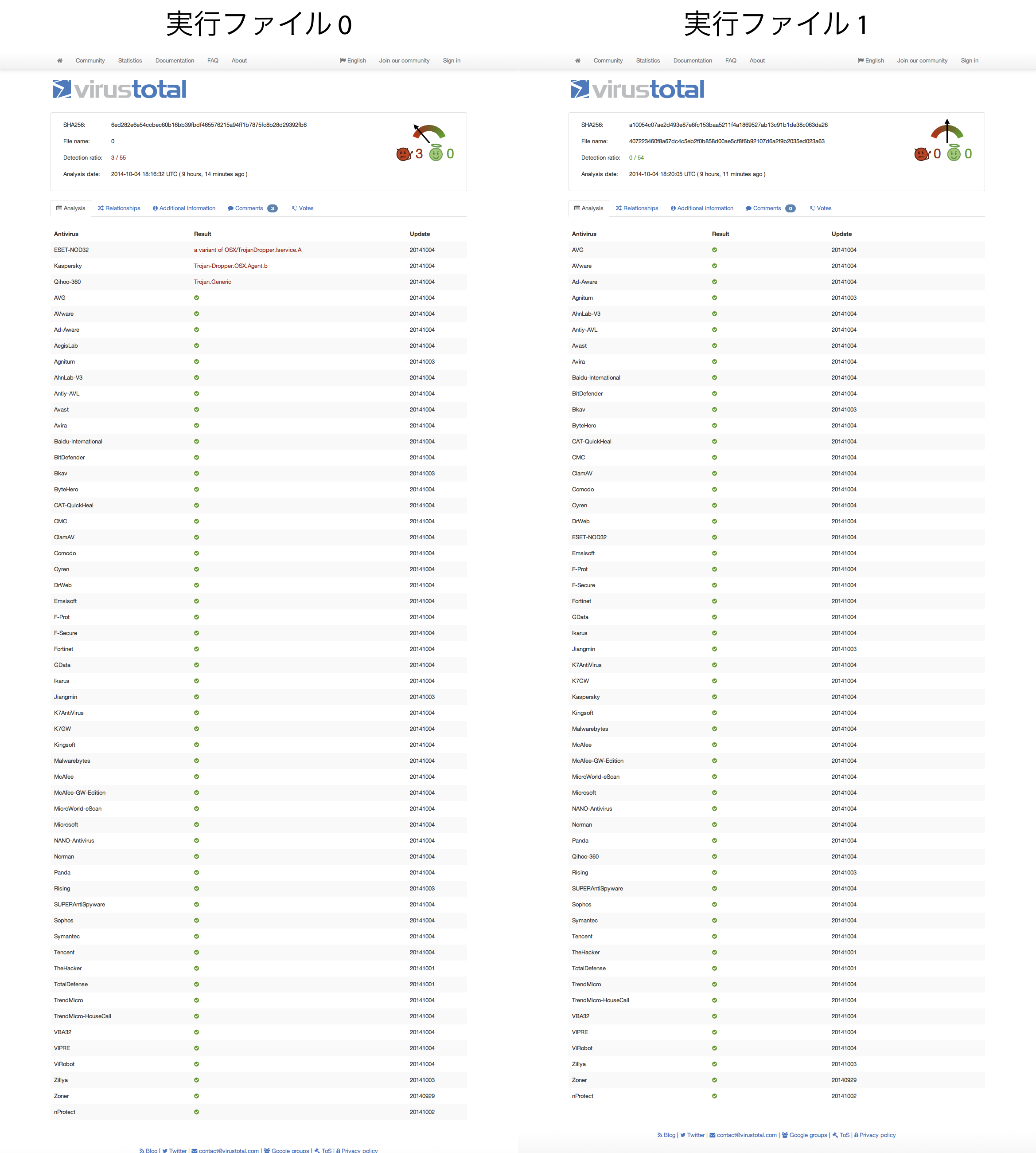 6.以上が実行ファイル「0」の動きで、さらに実行ファイル「1」の解析が進んでいるようで、現時点(10月4日)ではVirusTotal.comに「0」はトロイの木馬として登録されたものの「1」はどのウィルス検出アプリも未登録のようなので注意が必要です(The Safe Macのコメント欄参照)。