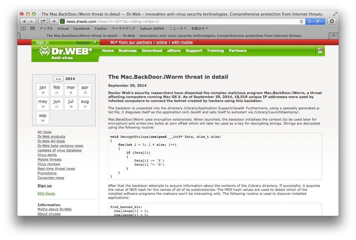 9月下旬から感染数が日に日に増えていっているMacを対象とした新しいボットネット型マルウェアOSX/iWorm-A(通称”Mac.BackDoor.iWorm”)ですが、その感染経路の1つが特定されたようです。