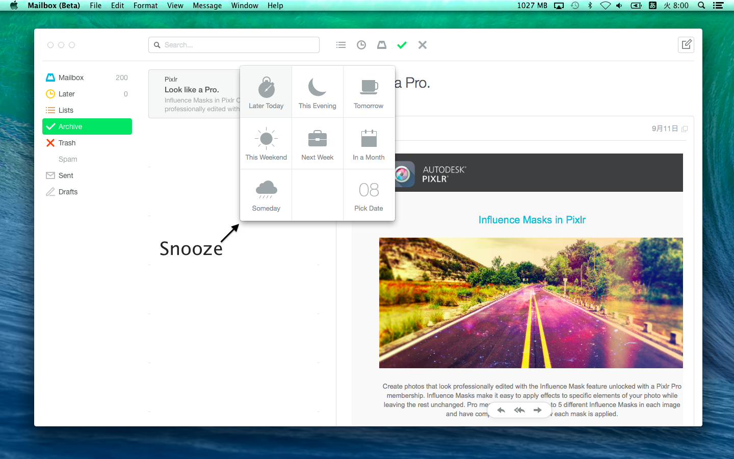 セットアップ後はiOSアプリと同様、他のメールアプリとは一味違うスワイプでのArchiveやTrash送りや、Snooze機能が体験できます。