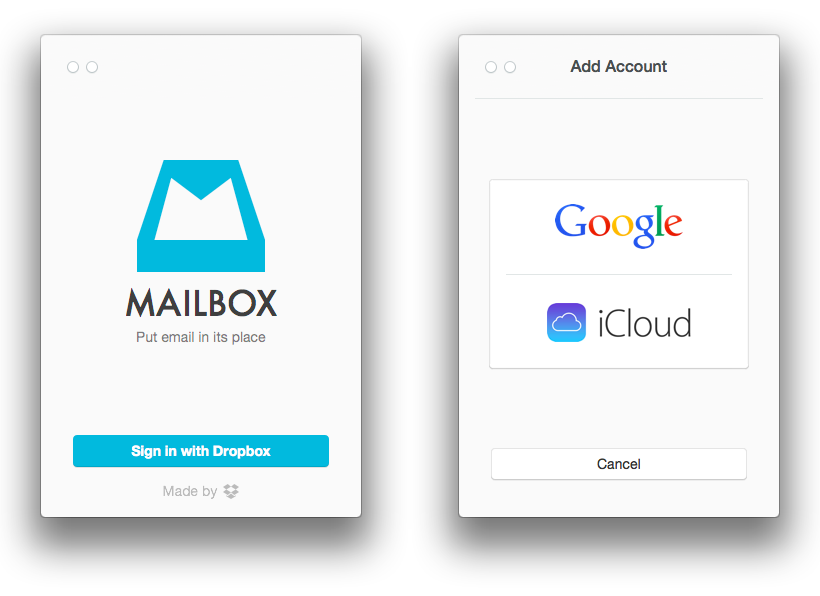 Beta版はMailBoxのサイトからダウンロード可能で、起動するとDropboxとメールアカウント(Gmail/iCloud)との連携を求められます。