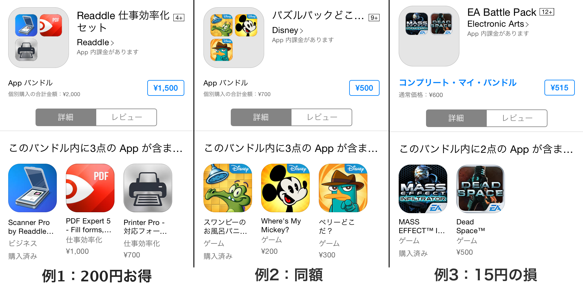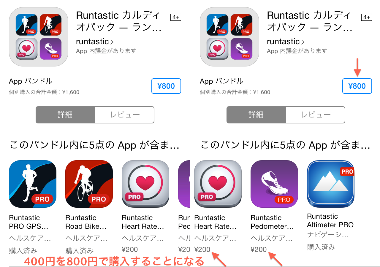 「数十円なら間違ってパックを購入してもいいか」という気持ちになるかもしれませんが、よく「無料セールアプリ」を購入する人の場合、以下の様に個別に買えば400円ですむ2つのアプリが、バンドル価格では800円となってしまう場合もあるので注意が必要のようです