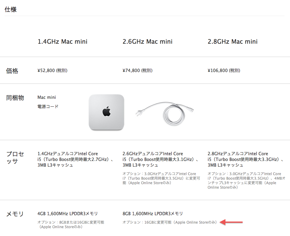 Appleにサイトに「Apple Online Storeのみ”only at the Apple Online Store”」という記載があるというコメントを頂きました。Mac mini Late 2012にはない記載なのでどうやらLate 2014はオンボードメモリのようです。