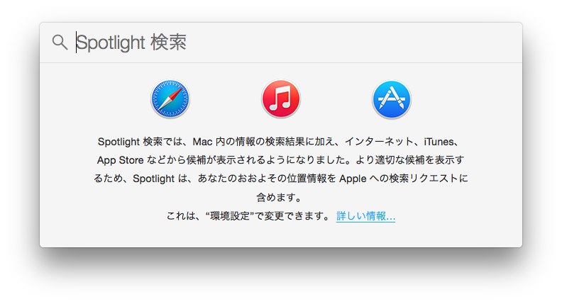 >OS X Yosemiteにアップグレードして、デフォルト設定でSpotlightを使うと、あなたが行ったローカル検索のワード(term)と位置情報がAppleとMicrosoftに送信されます。