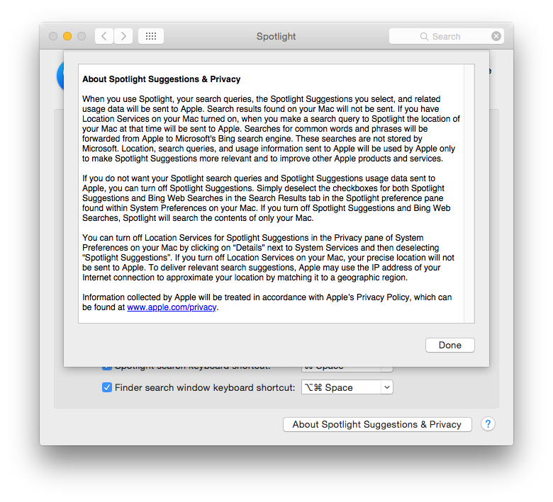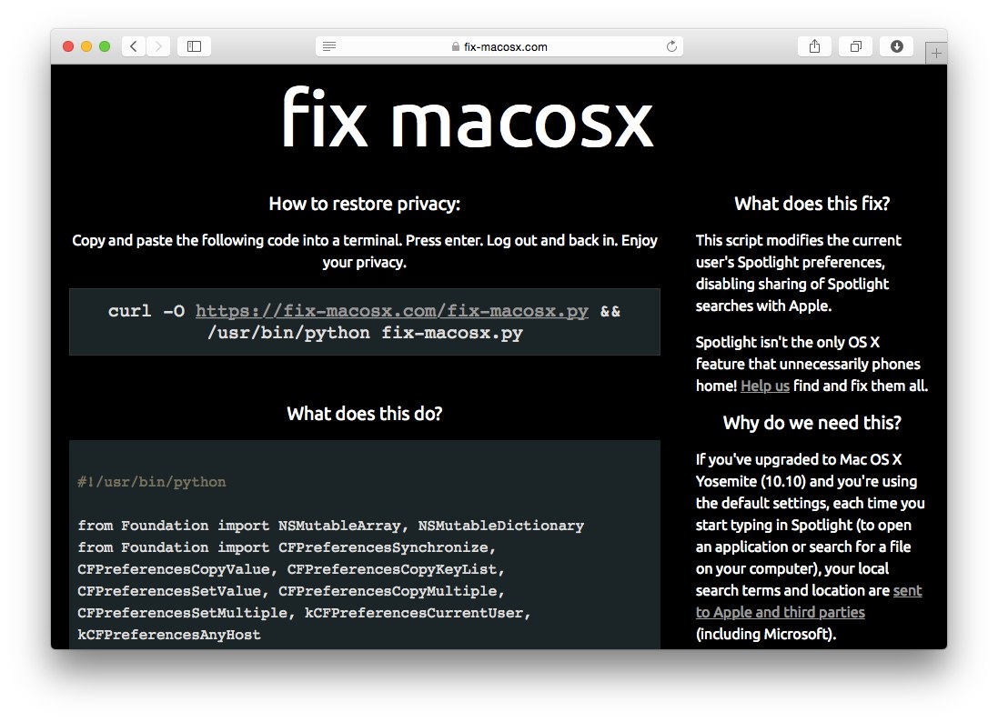 Like privacy? Don’t want your Mac OS X spotlight searches sent to Apple and friends? I made a thing: https://t.co/Wd8w3fOfgo /cc @micahflee