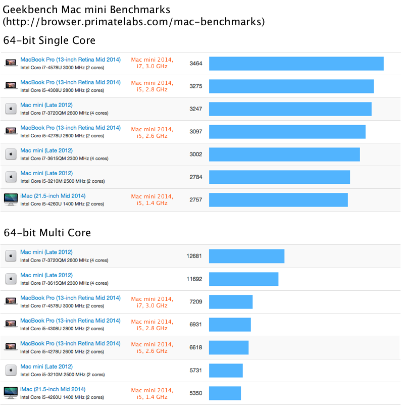 ここまでまとめて、いろいろ調べていたところMacRumorsのVoteが多い投稿に「Mac miniのスコアは過去のプロダクト(iMacやMacBook)のGeekbenchスコアからこんな感じ」(コメントすら書かれていませんが)という画像が貼り付けてあり、Vote数通り他のMacのGeekbenchスコアを使って比較するならこれが一番分かりやすいと思います。