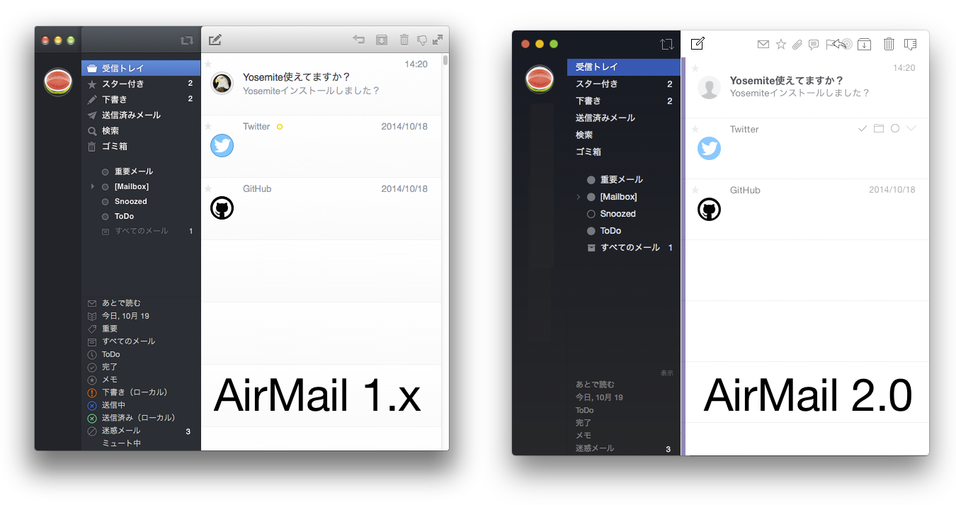 購入してみましたがAirMail 2.0では新たにプラグイン、Share Extension(iOSの様にスワイプでフラグ・ゴミ箱へ)、iCloud を使用したアカウント共有、Google OAUTHなどの機能(Feature List)が追加されており、デザインもOS X Yosemiteの場合磨りガラス(Blur)効果がリストにかかっています。