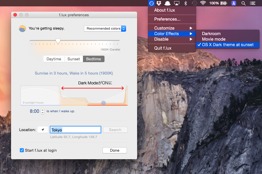 使い方はメニュバーのf.luxアイコンから[Color Effects] > [OS X Dark theme at sunset]をONするだけです、後は夕暮れ(Sunset)から深夜(Bedtime)になると自動的に”Dark Mode”になります。