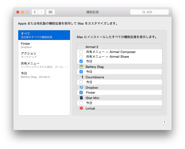 OS X Yosemiteのシステム環境設定にはMavericksには無かった「機能拡張」という項目が増えています、この機能拡張はWWDC 2014で発表された通り今までサードパーティ製アプリ個々が提供/設定していたFinder メニュー、アクション、コンテキストメニュー項目などを一括で管理できます。