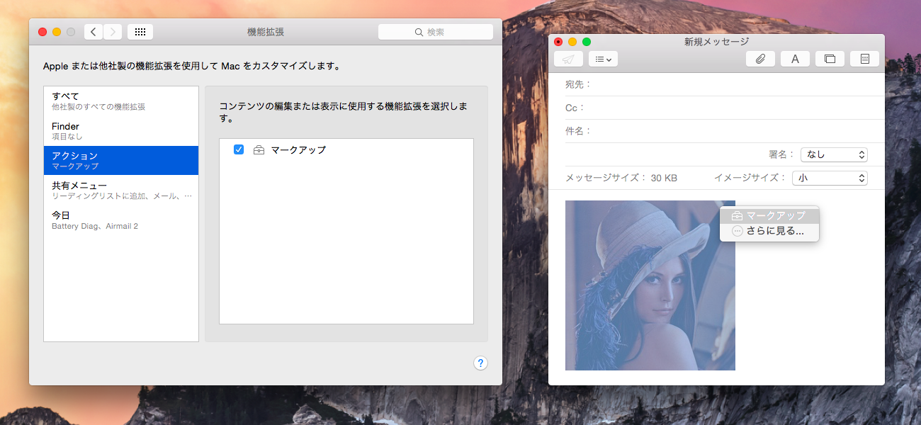 「アクション」項目では特定のアプリケーションで他のアプリケーションのツイールと連携出来るアクション項目が表示されるのをON、OFFすることが出来ます。例えばメールアプリからプレビューアプリのマークアップツールを直接使うことも可能です。