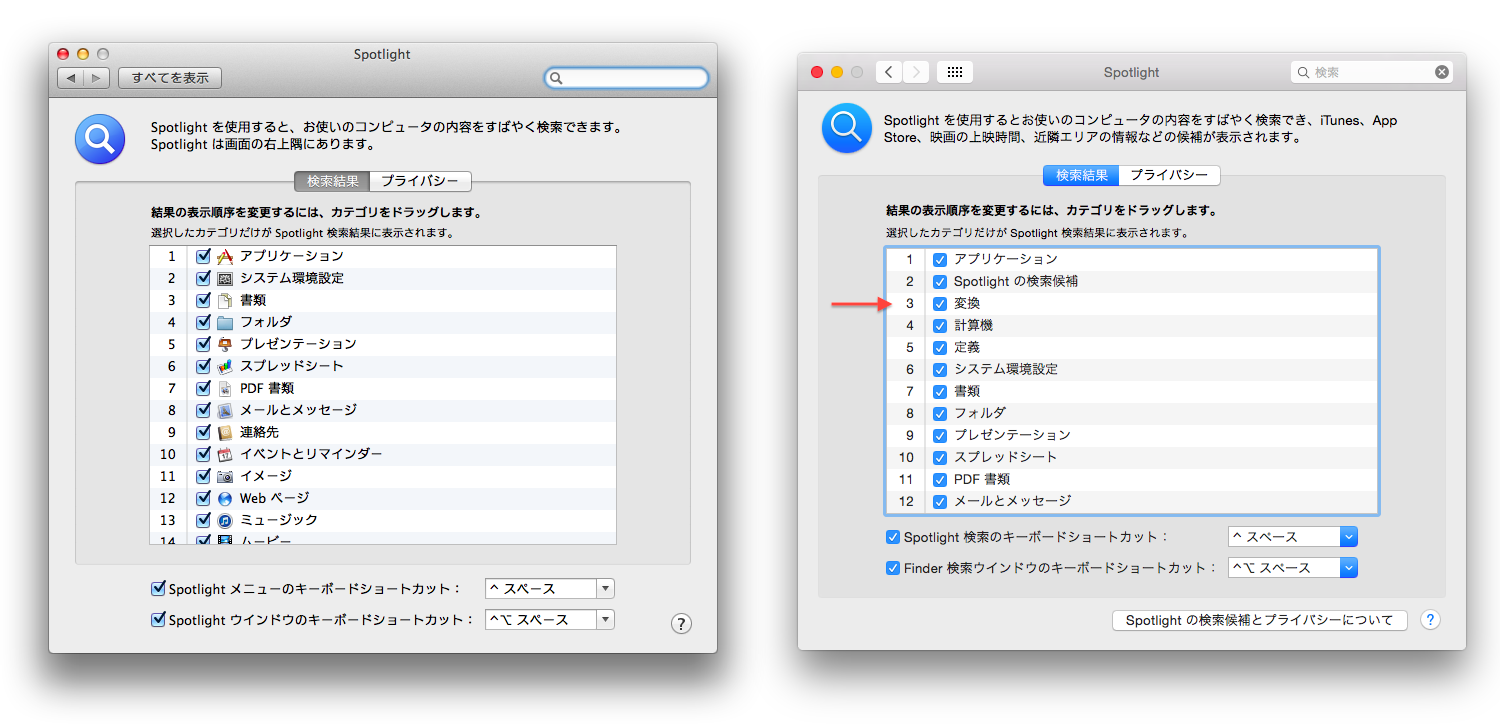 新しいSpotlightの「単位」は入力した単位の変換(単位換算)をしてくれる機能で、システム環境設定の[Spotlight] > [検索結果] > [変換]がONになていれば使用可能で、