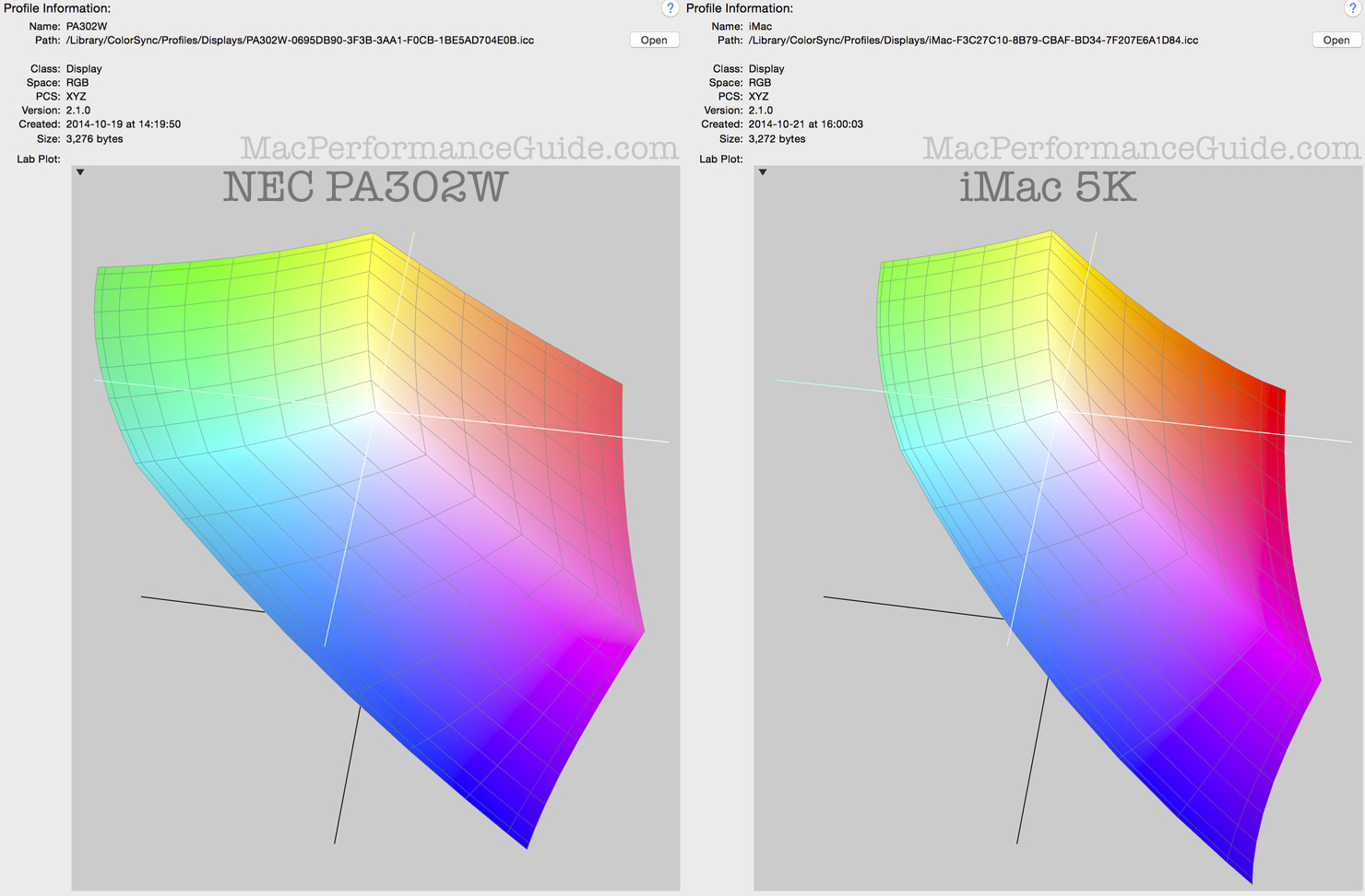 Macの「ColorSysncユーティリティ.app」で表示したiMac with Retina 5K display(右)とNEC PA302W(左)のガモット図(色域図)は以下の通りで「(Retina iMacは)広大なスクリーンではあるもののNEC PA302Wに比べてはるかに狭い」とコメントしています。