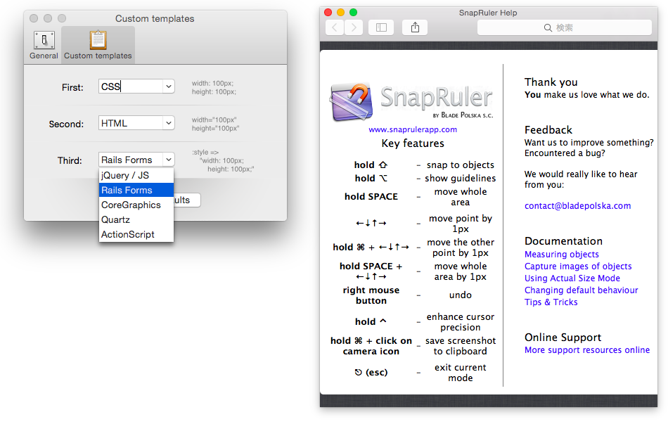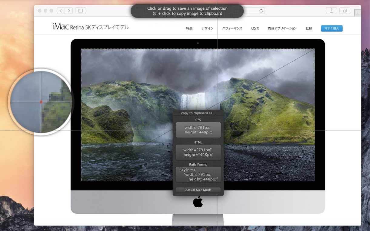 その他にもフォーマットをDimensions, HTML, CSS, SCSS, HTML, jQuery, JS, Rails Forms, CoreGraphics, Quartz, ActionScript形式から選択したり、細かいエリア選択も可能です。