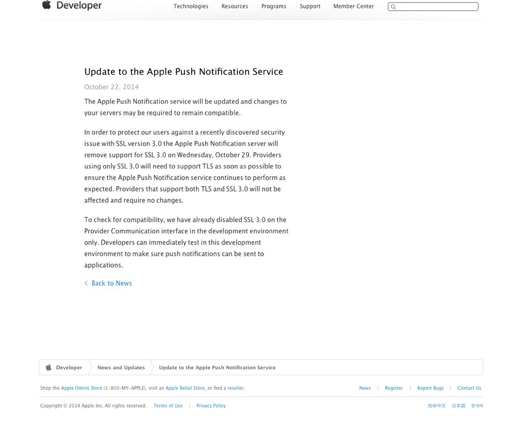 Apple Developer Newsには「SSV v3.0脆弱性に対応するため10月29日をもってAPNSではSSL v3.0を非サポートとします。SSL v3.0だけを使用しているプロバイダはTLSをサポートしAPNSに対応するか確認する必要があり、互換性をチェックするために開発環境ではすでにSSL v3.0を無効にしてあります。開発者はこれを使用してプッシュ通知をテストすることが出来ます。」と掲載されており、iOS 8.1やOS X Security Update 2014-005で対応したSSL v3.0の脆弱性をサーバー側でも対応するようです。