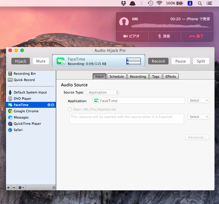 実際に使用してみましたが、Audio Hijack Proを起動してFaceTimeから発信、FaceTimeを選択し[Hijack] > [Record]を押すだけで録音が始まります。