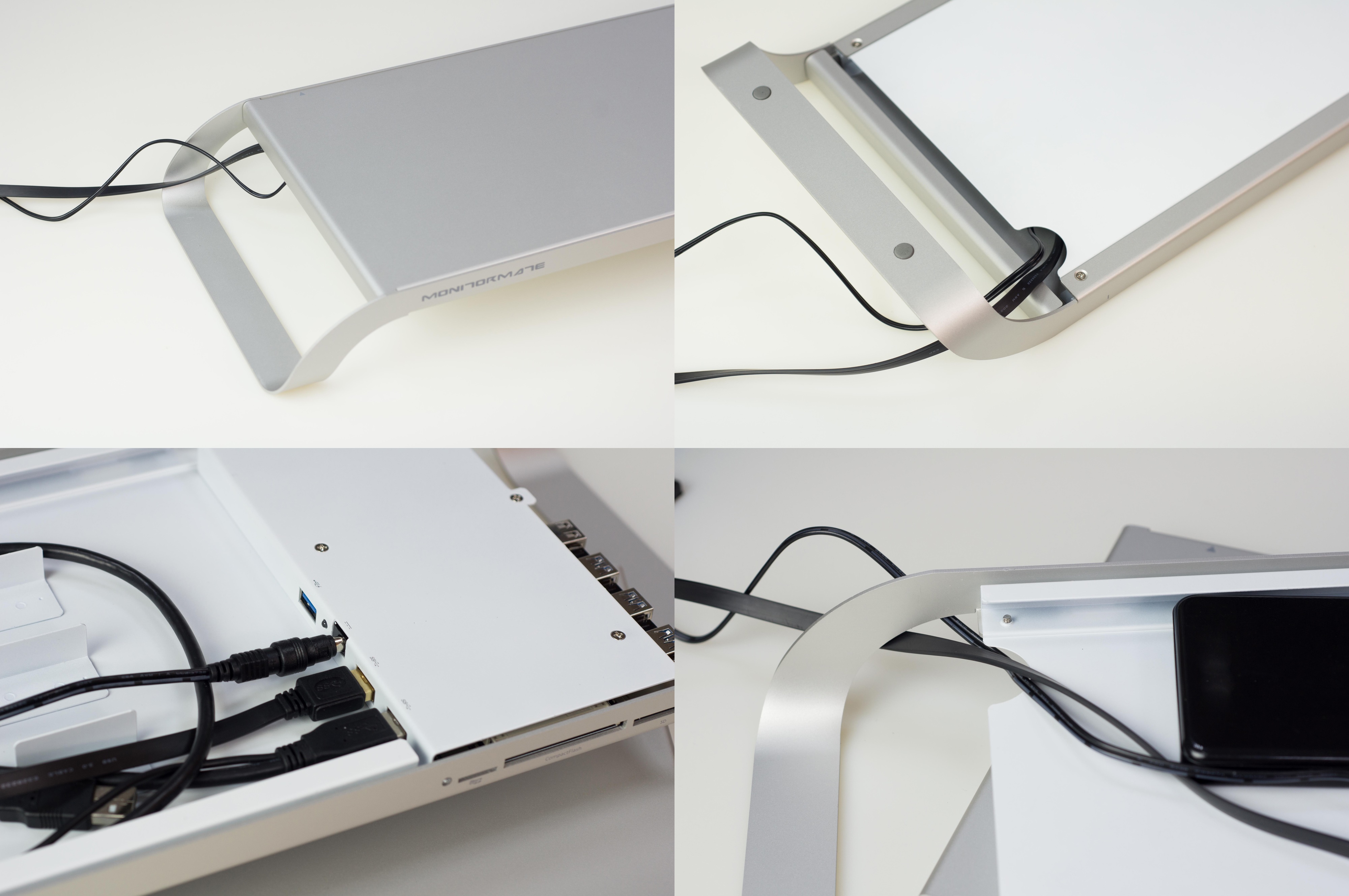 USBやACアダプタ ケーブルは収納スペースサイドから出るようになっており、キーボード収納スペースは幅480mmx高さ40mm、本体サイズは幅590 x 奥210 x 高65 mmで重さは2.0kg、スタンドが耐えられる重さは30kgまで可能。