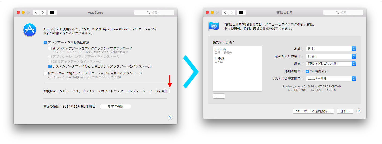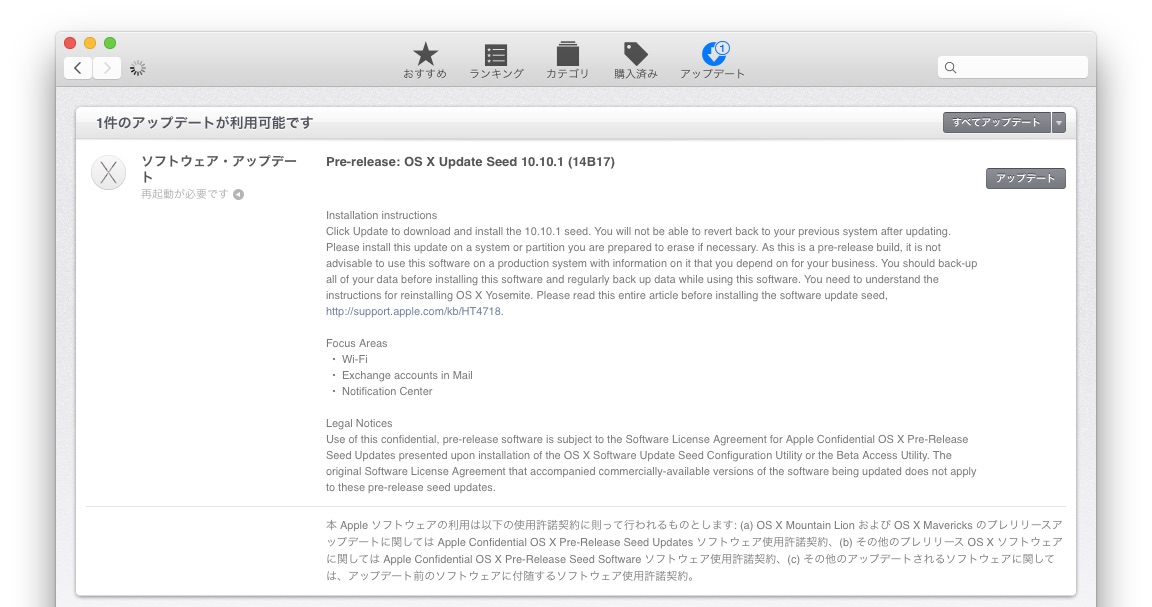 OS X YosemiteのBeta Programメンバーに通知される「Pre-Release OS X Update Seed」の受信を止める方法です。詳細は以下から。