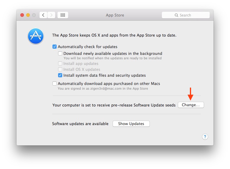 2.システム環境設定.appの [App Store]から”Your computer is set to receive pre-release Software Update seeds”(お使いのコンピュータは、プレリリースのソフトウェア・アップデート・シードを受信するように設定されています)の[Change…]ボタンをクリック。