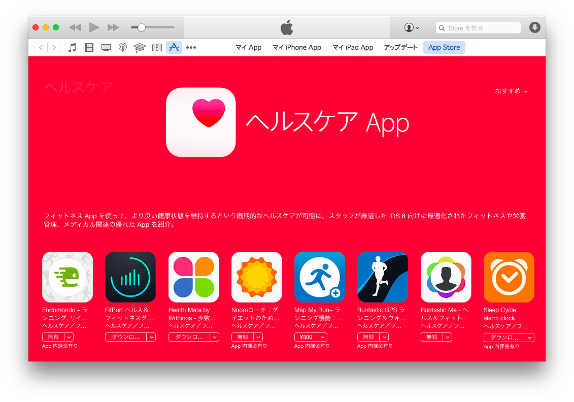 アメリカでは9月27日に”Apps for Health”という新しいセクションが作られていたヘルスケアアプリですが、iOS 8での不具合など色々ありなかなか公開されなかった特設ページが日本でも「ヘルスケア App」としてiTunes Storeに出来たようです。