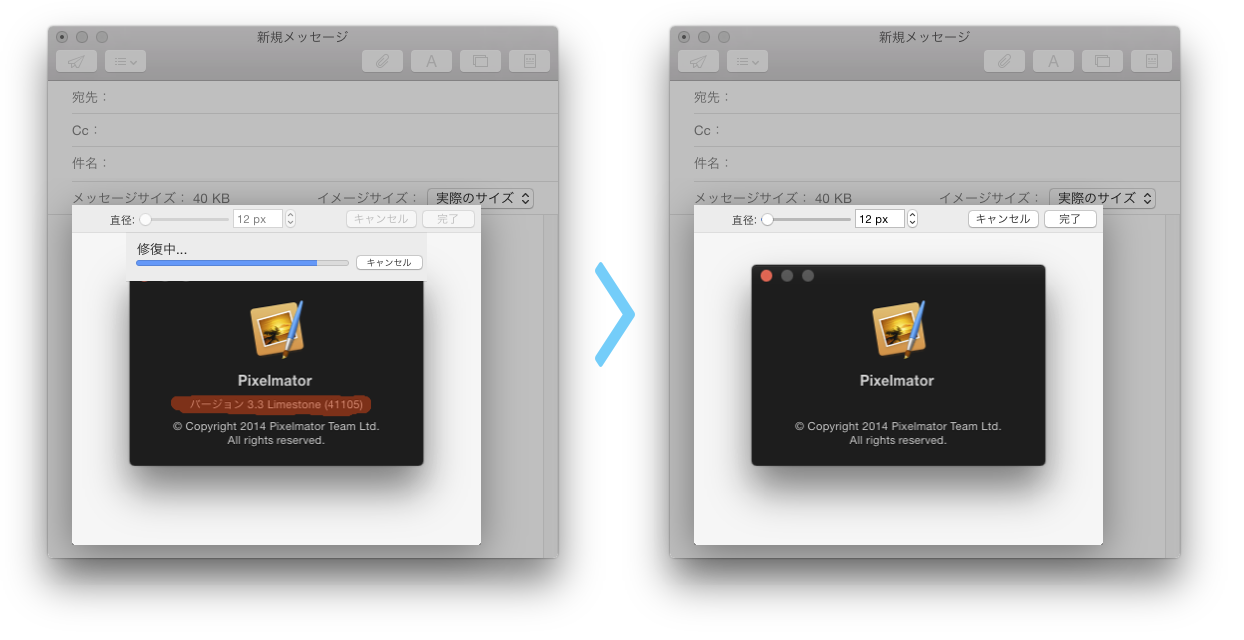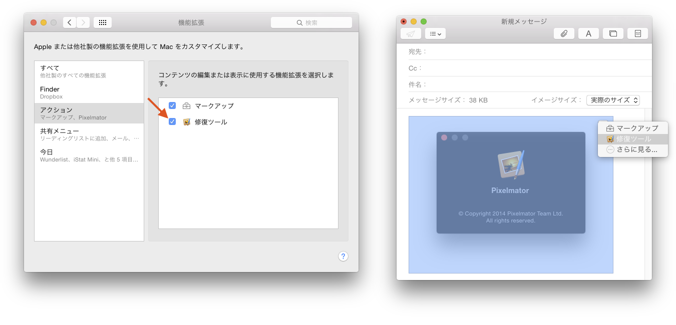 修復ツール拡張機能は「機能拡張のアクション」の事で、メールやテキストエディタに画像を添付した際、その画像の一部を消すことが出来る「修復ツール」がPixelmatorを起動すること無く使用できます。