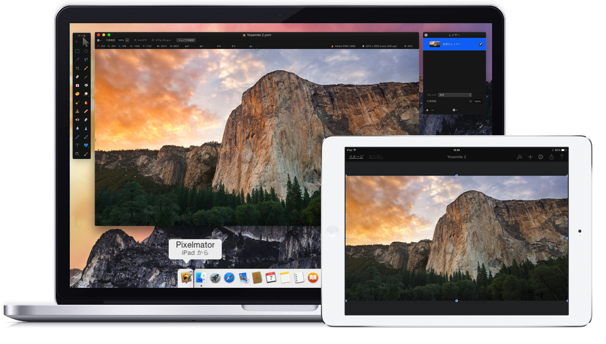 WWDC 2014でPixelmator for iPadを発表したPixelmatorですが、Mac版 v3.3ではiPad版とのHandoffが使用可能になっており、Macで編集したものをiPadでも引き続き編集可能です。