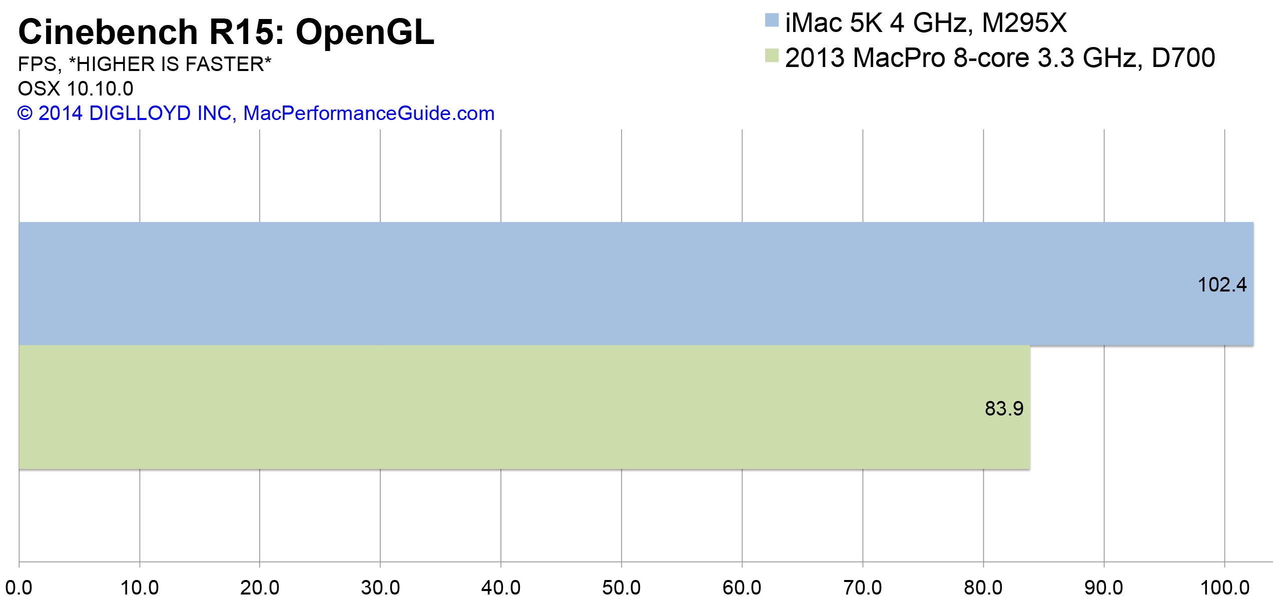 最期に、Mac Performance GuideがMac Pro Late 2013(AMD FirePro D700 x2 6GB GDDR5, SP数 2048基)とiMac with Retina 5K display(AMD Radeon R9 M295X 4GB DDR5, SP数 2048基)のCinebench R15 OpenGLテスト結果を公開しており、この値でもiMacがMac Proのスコアを上回ているのでAMD Radeon R9 M295Xは現在Macで使用できるGPUとしては最高クラスのGPUのようです。