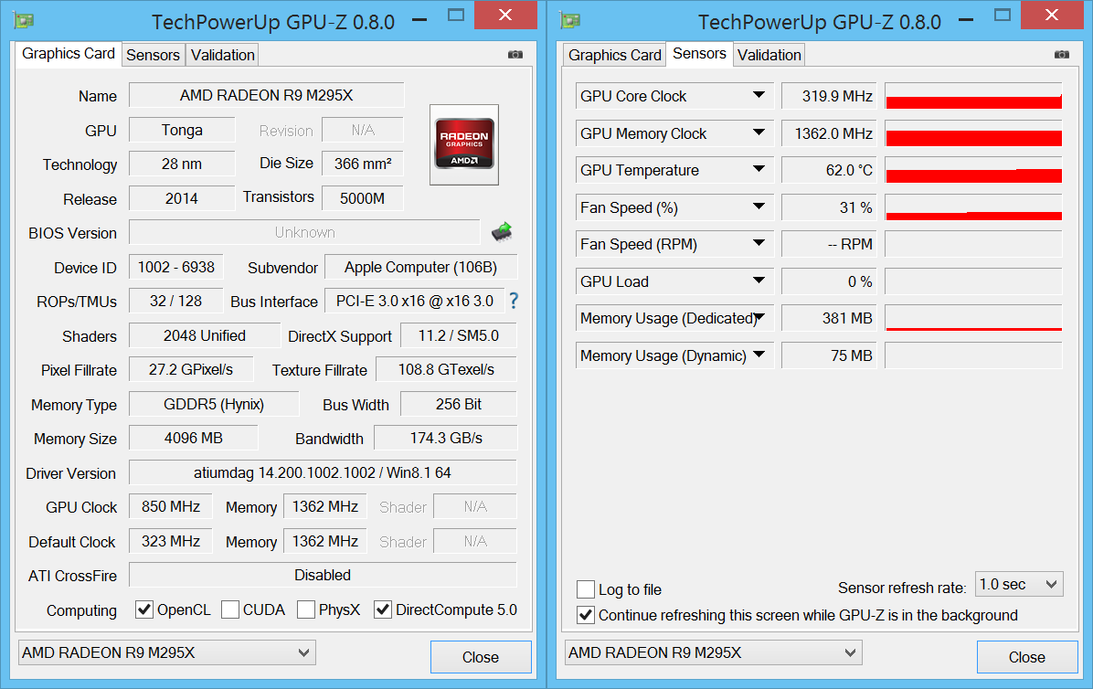Update: Here’s the GPU-Z output, showing the reported details on the Radeon R9 M295X. As expected, the GPU is an AMD , running at 850MHz: